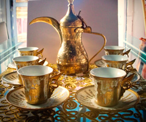 opción 1 Cafetera hecha en bronce grabados más juego de café de porcelana